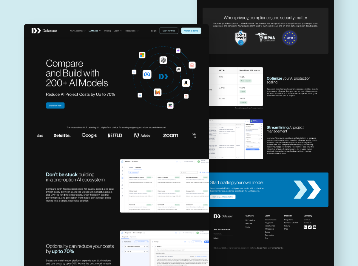 Datasaur is a tech startup that offers two key AI products for businesses: Natural Language Processing (NLP) labelling and a private Large Language Model (LLM) development platform. As the company expanded, they wanted to profesionalize Datasaur’s image to appeal to enterprises and align with their core focus areas. They wanted to move away from the dinosaur motif in their brand and develop a new brand to convey a more serious and professional image that reflects its position at the cutting edge of AI while maintaining appeal to data scientists. The result was a new logo that uses cheverons to form a “D” together with the shape of a label. A comprehensive brand guidelines along with branded templates were also developed that allowed for flexibility while maintaining a clean and authoritative aesthetic.